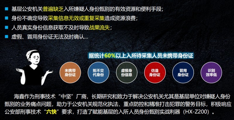 海鑫人員信息一體化采集系統(tǒng)主要用于公安基層科所隊、執(zhí)法辦案中心等部門,由人員信息一體化采集管理系統(tǒng)和人員信息一體化采集設(shè)備組成。人員信息一體化采集設(shè)備集一體化采集客戶端軟件和多種采集設(shè)備于一體,標(biāo)準(zhǔn)化、一體化采集人員的基本信息、二代證、指掌紋、人像、身高體重足長、虹膜、聲紋、足跡、DNA、筆跡、特殊體征、手機、隨身物品、銀行卡等信息,采集數(shù)據(jù)全面符合公安部關(guān)于人員基礎(chǔ)信息采集數(shù)據(jù)項和數(shù)據(jù)質(zhì)量的標(biāo)準(zhǔn)要求。人員信息一體化采集管理系統(tǒng)主要提供采集數(shù)據(jù)質(zhì)量管理、采集設(shè)備運維管理、采集數(shù)據(jù)和流程配置管理、人員比中信息管理、人員全息檔案、彩云搜、統(tǒng)計考核等功能,系統(tǒng)通過與警綜平臺、刑專系統(tǒng)、大數(shù)據(jù)平臺以及各專業(yè)比對系統(tǒng)之間的有效關(guān)聯(lián),真正實現(xiàn)人員信息采比反一體化應(yīng)用,為公安機關(guān)網(wǎng)上追逃布控、身份信息核實、前科犯罪打處查詢、倒查破獲現(xiàn)案積案、重點人員預(yù)警管控提供重要數(shù)據(jù)和系統(tǒng)支撐。