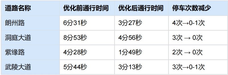 基于現場實際駕車測試,朗州路平峰時段,從北向南方向優化前開車需要6分31秒、停車4次,優化后只需3分27秒、最多停車1次。
