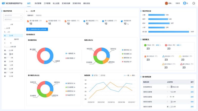 系統將轄區內學校現有的靜態數據及動態運行數據進行有效的整合,實現整體風險形勢、統計數據、地理分布、趨勢分析、隱患及整改情況、專項整治等數據的實時分析及呈現,快速準確地為行業部門提供數據信息并提供決策依據。