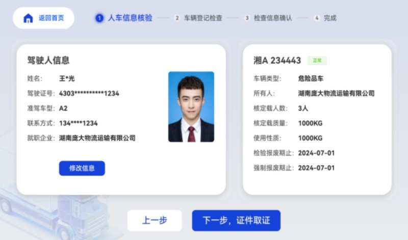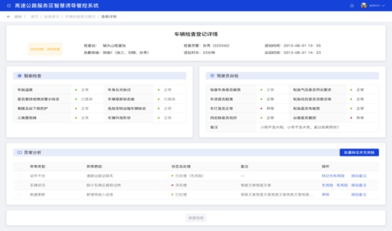 車輛檢查登記智能檢查:車輛進站后,由駕駛人自主在自助檢查終端進行車輛檢查登記,登記完成后,如車輛未有智能設備識別的異常,則提示駕駛人安全駛離。