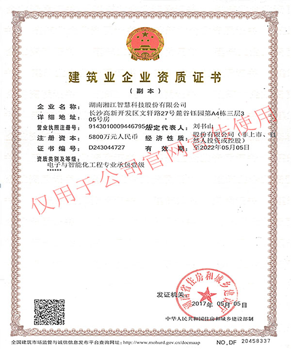此次電子與智能化工程專業承包一級資質的取得,體現了湘江智慧在建筑智能化工程領域已具備了專業承接實施能力,它將有利于拓展公司經營范圍,提高大型工程的承攬能力,進一步提升公司核心競爭力和品牌影響力!