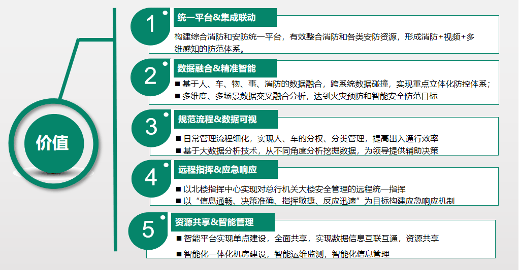 安消防一體化智能系統平臺對視頻監控、消防管理、出入口控制、信息化巡檢、用戶管理、關聯控制、數據存儲、遠程管理等功能模塊實現無縫整合和管理,能夠實現大樓新建子系統之間的聯動,包括可視化的視頻報警聯動、視頻消防聯動、出入口人員身份中心查詢和復核、車輛出入口抓拍實現中心數據存儲與調閱、前端智能分析主動上傳異常信息并聯動中心視頻遠程管控等,從而將大樓各個部位的安保工作進行緊密結合。